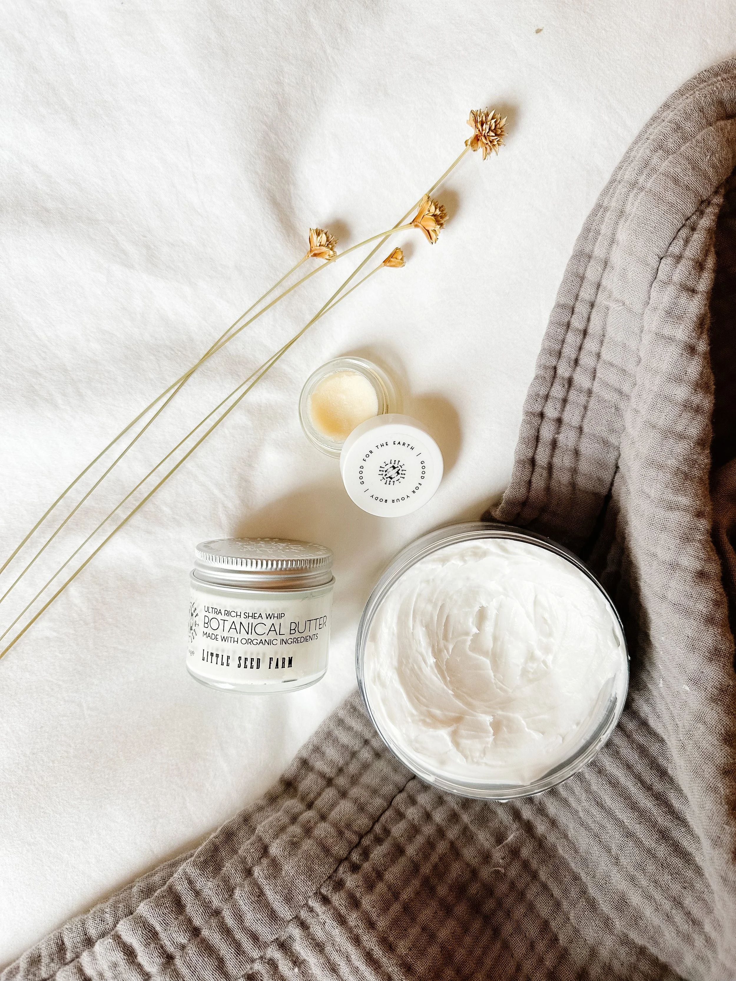 To combat dry, dull skin I love applying a nice body butter to my whole body after my shower each morning. I wrap up in my favorite robe afterward so that it can dry while I get ready and isn’t too sticky when I get dressed. I recently found Little Seed Farm and am LOVING their products! Their Hand Aid is a favorite healing balm for very dry feet and hands. At nighttime apply this and pop some socks on your hands and feet. Let it do its job while you sleep. My nighttime routine also incorporates their Botanical Butter on my face and their Honey Lip Treatment. I wake up with happy, nourished skin.