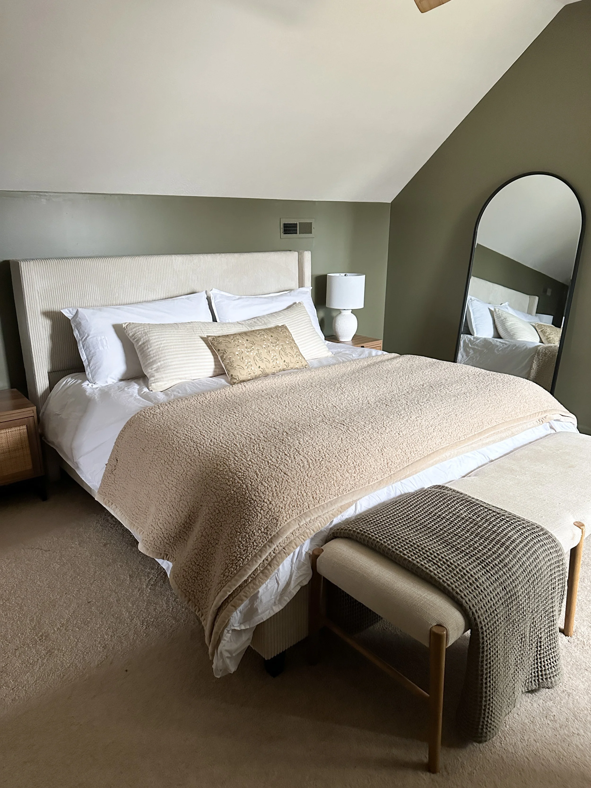 I am still debating painting the ceiling the same color. We only have one small dormer window in our bedroom and so for now, I left the ceiling white so that it doesn’t feel too dark. But I can be convinced to paint it…what do you think?