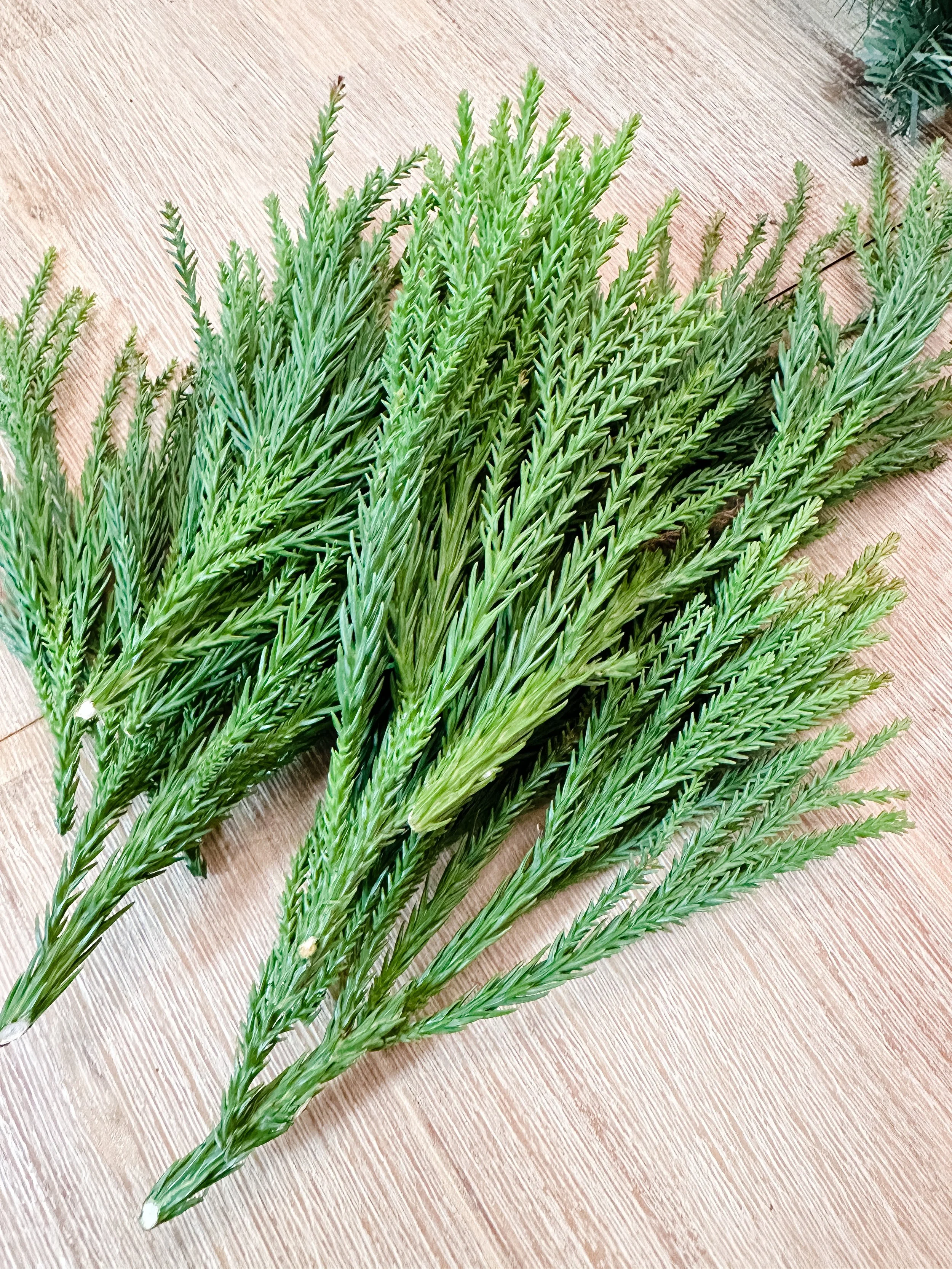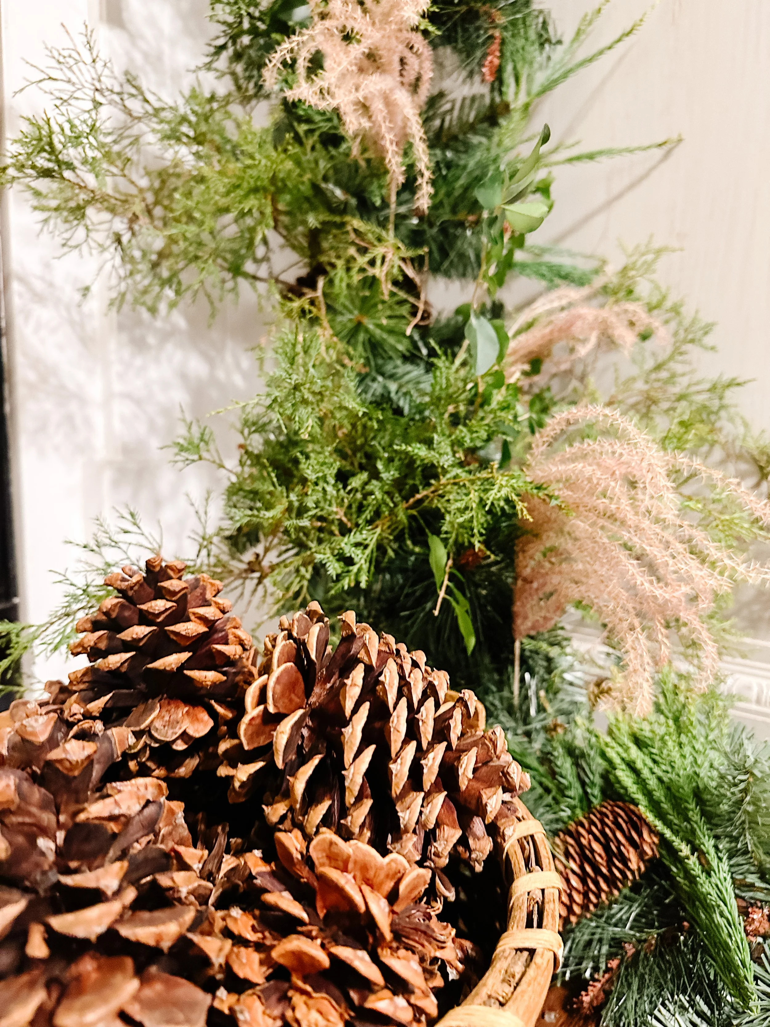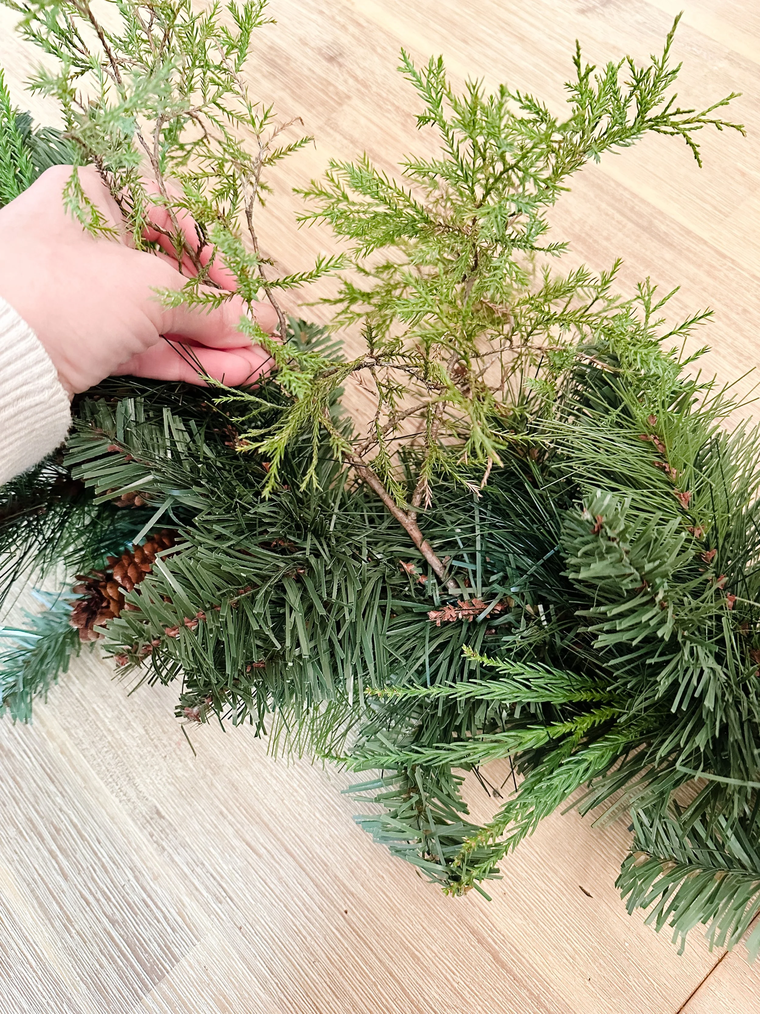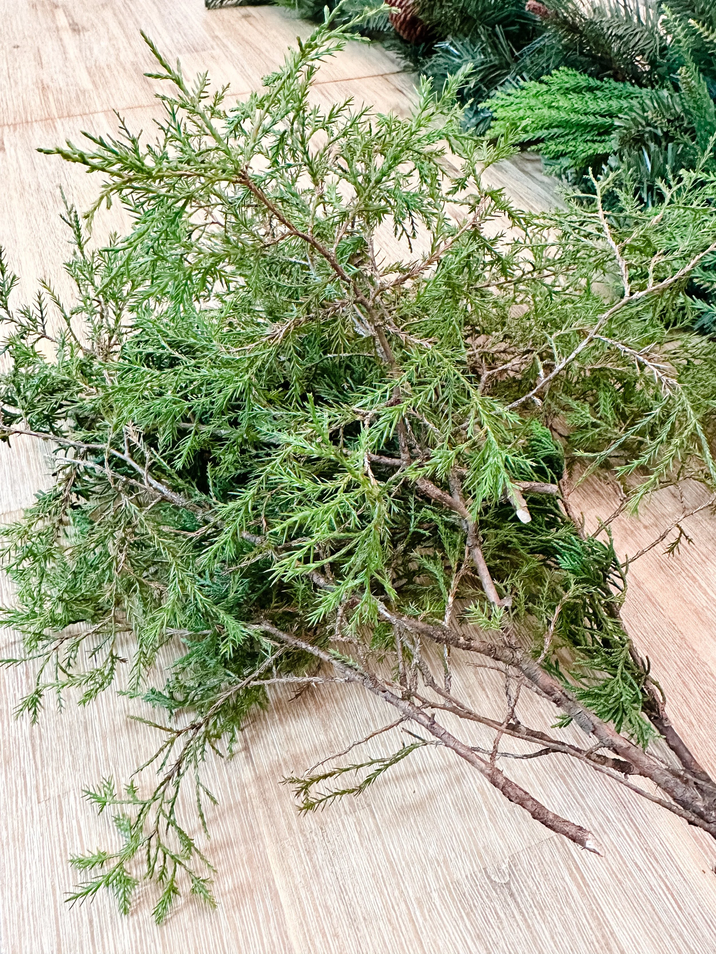 I chose to add in the Easter Red Cedar I had found next because it is also a really hearty green but a bit lighter than the Japanese Cedar. (I’m using my handy plant app to find out what all of these new greens are called as I’m writing this. All new things in my life…including the trees.) I simply cut the branches to give a good piece at the end for tucking in the greenery. I truly didn’t even have to use floral wire on this project, but you sure could if you wanted to make it more secure.