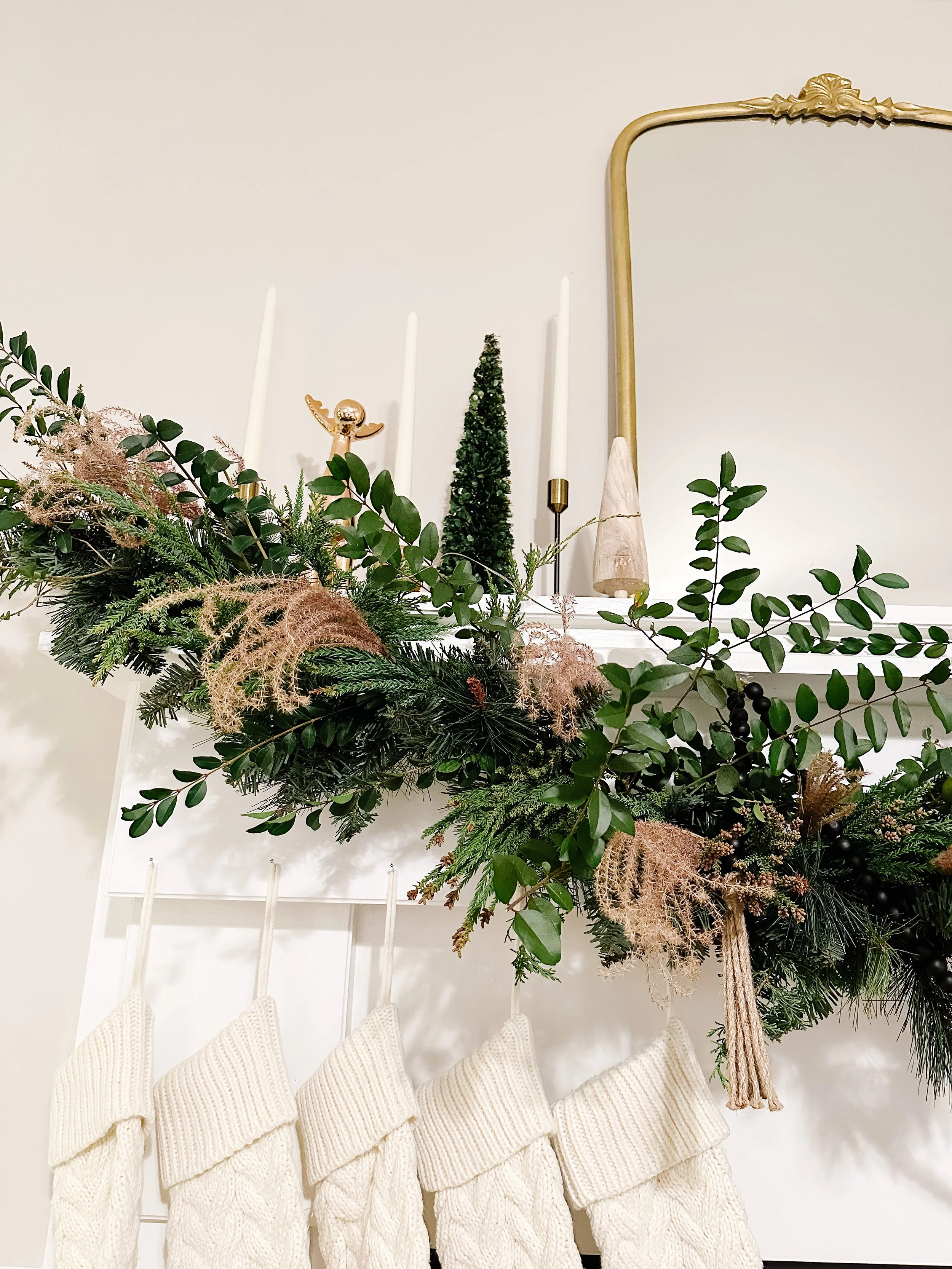 I love decorating the mantle and really wanted a garland that was lush, textural and organic. There is something special about having a real tree and real greenery around the house. However, it became apparent that it wasn’t going to be an easy reality here. And, so I got creative.