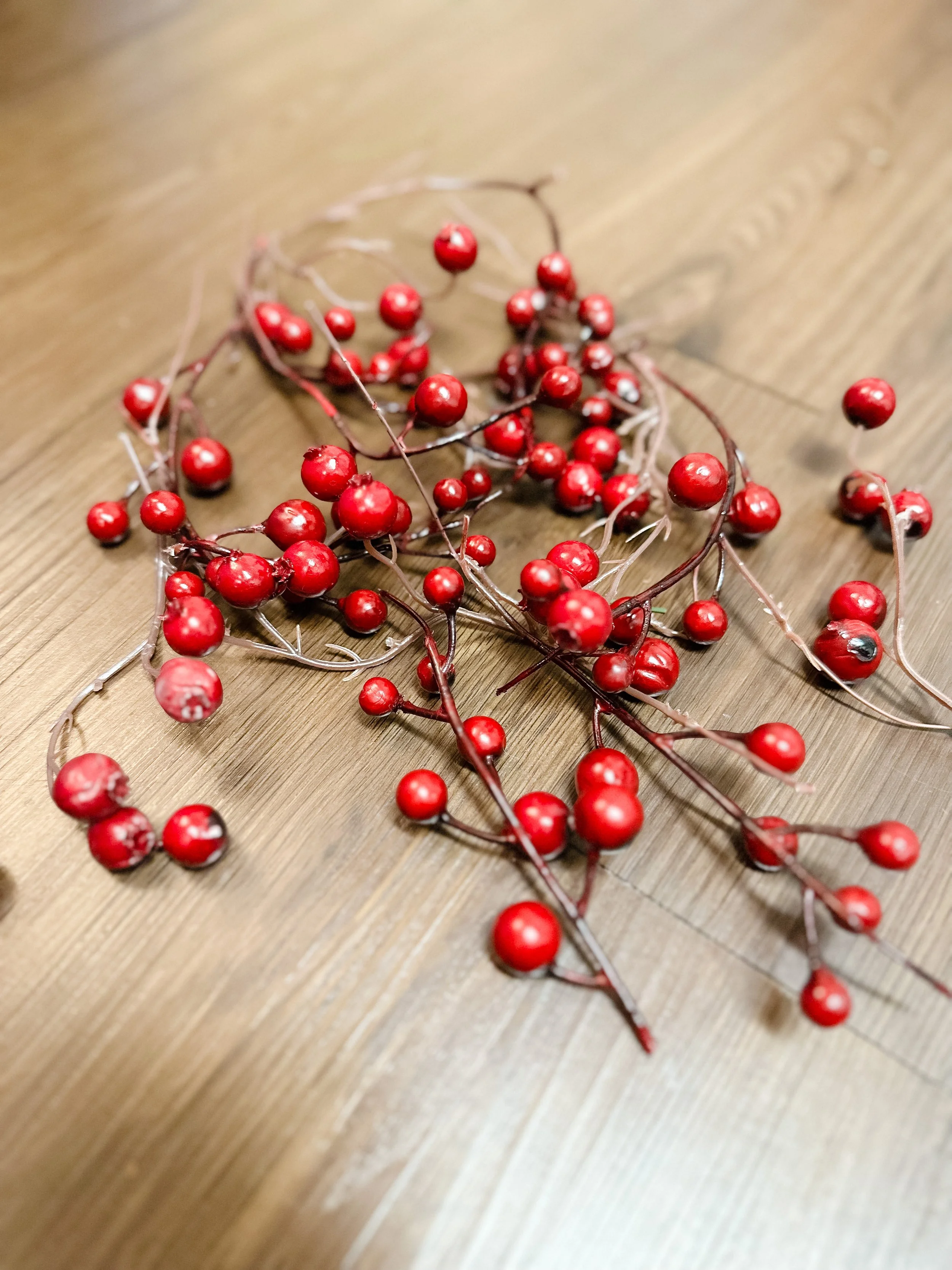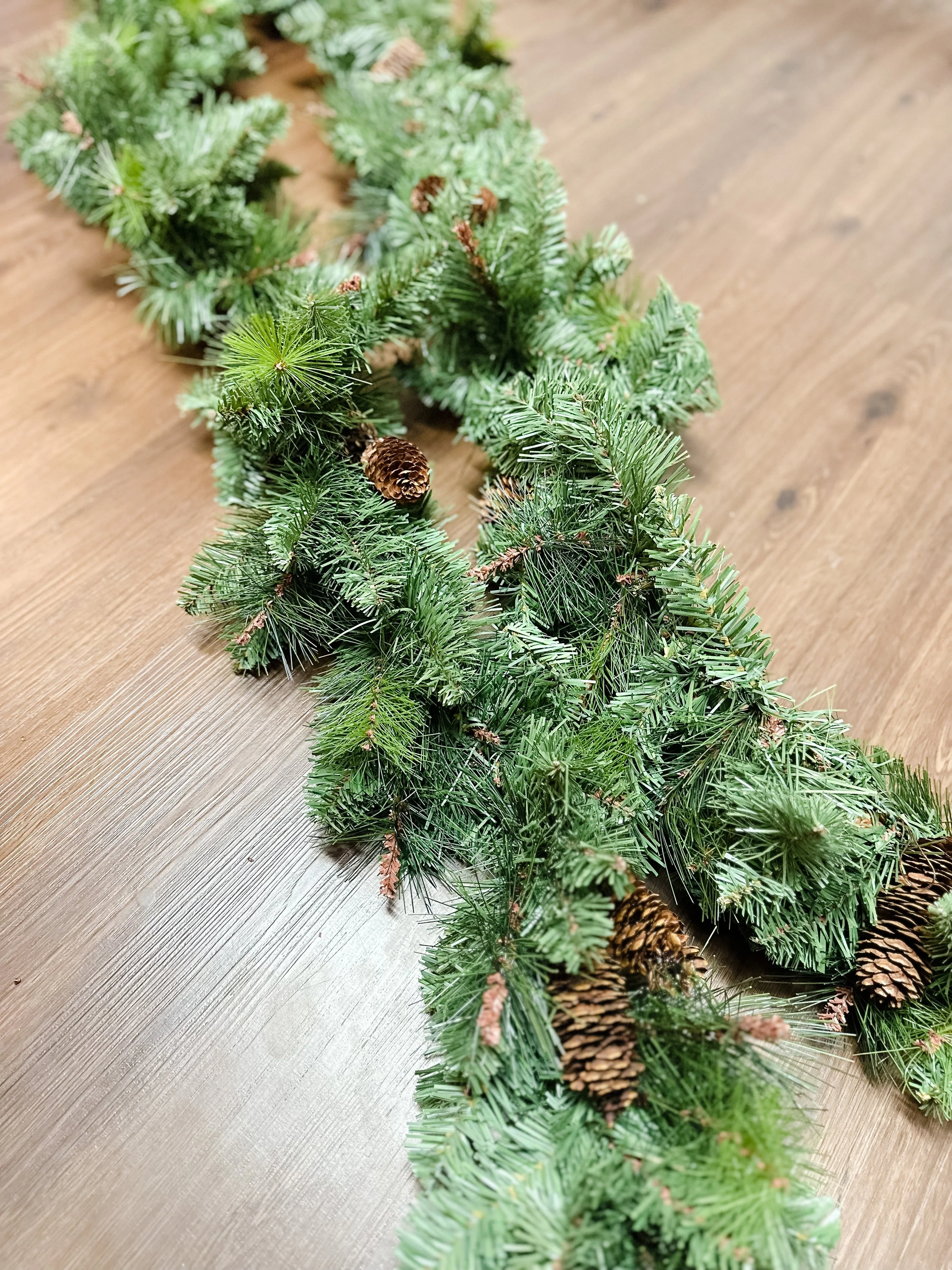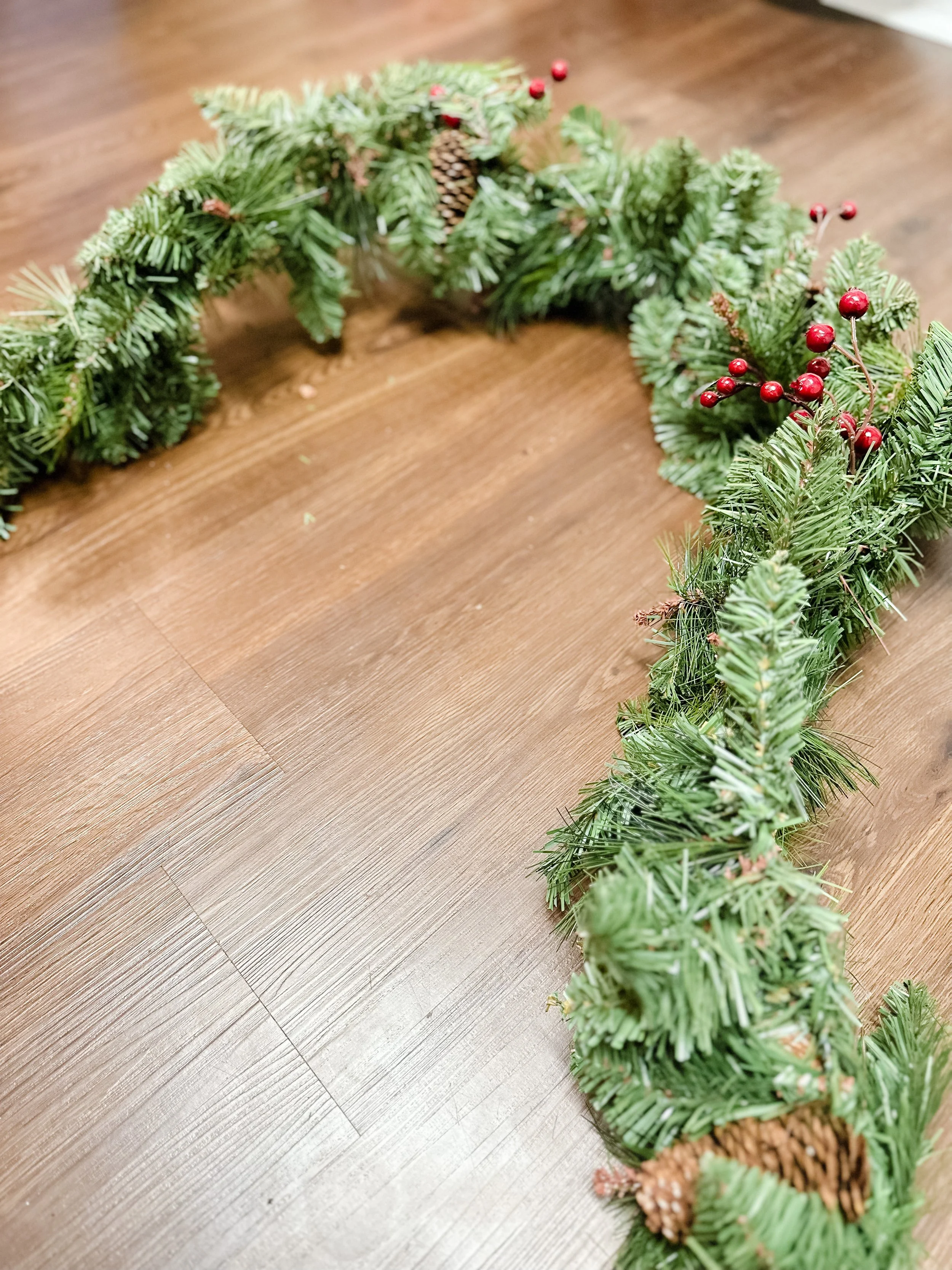 Simple, unexciting garlands on sale for $16 a piece…perfect! Greenery, pinecones and fake berries, that was it. It was just the right place to start. I bought two because I wanted to create an asymmetric garland that hung to the floor on one side of my mantle and each of the garlands was 5 feet long. I headed home and got to work…