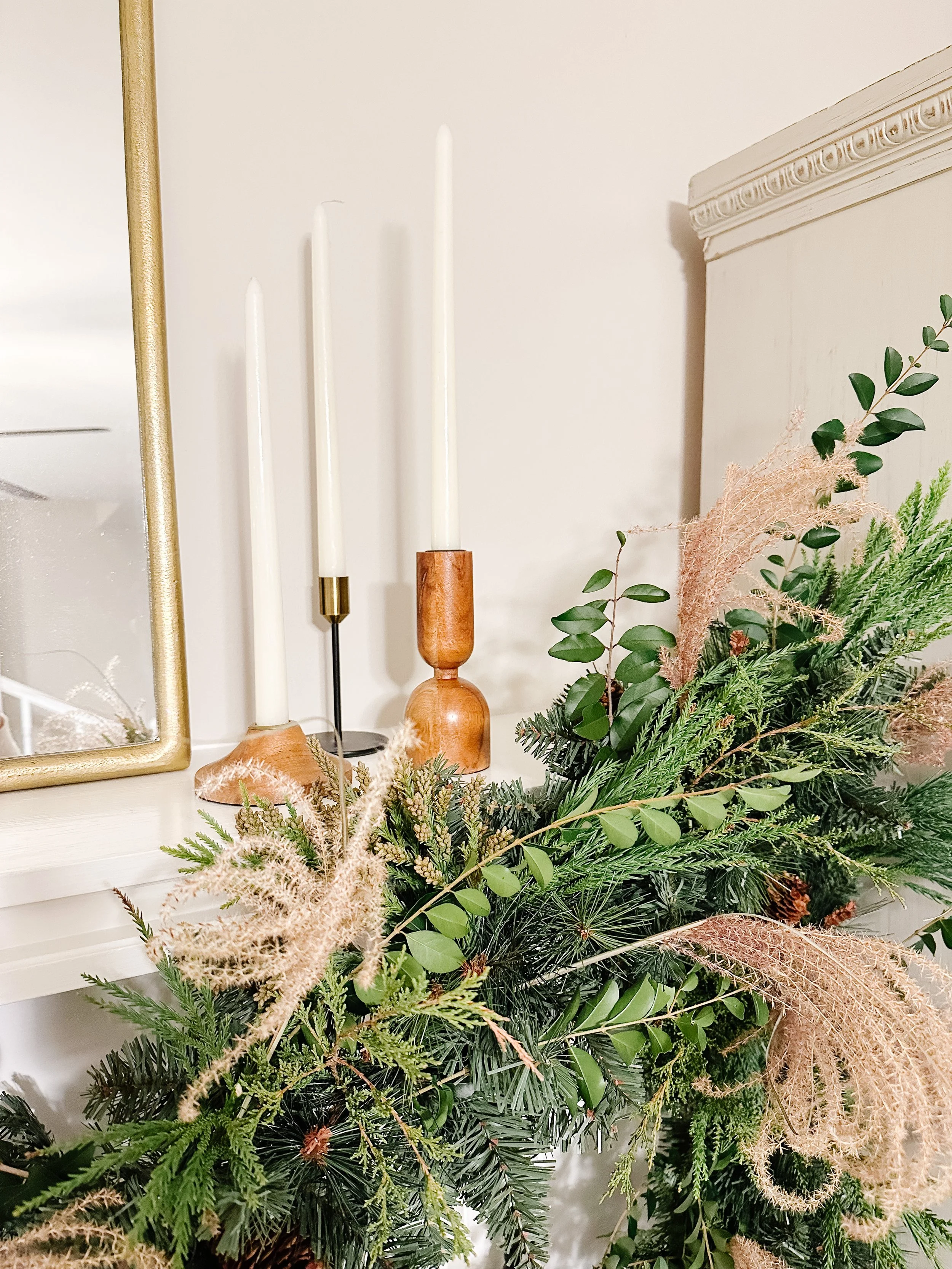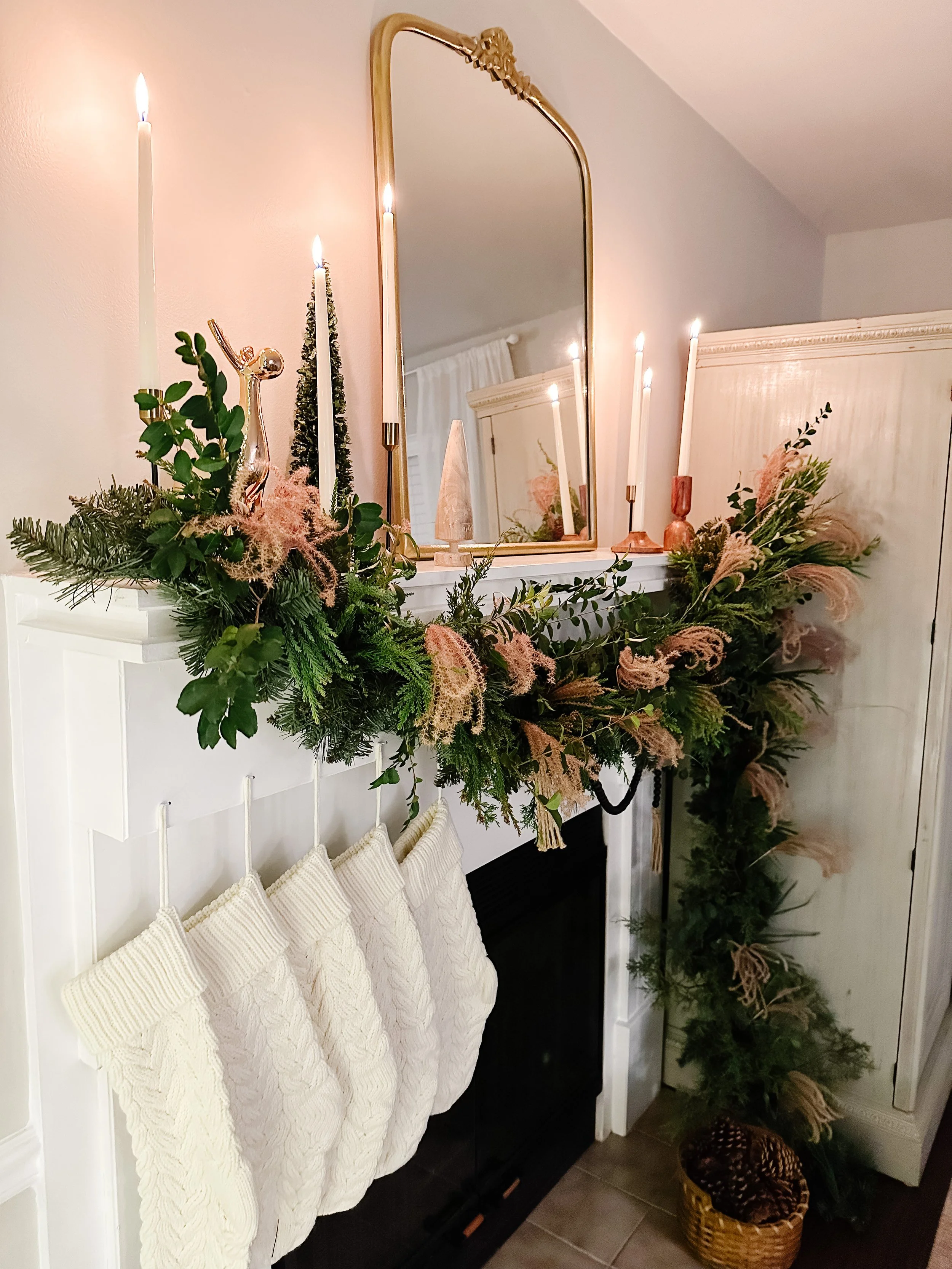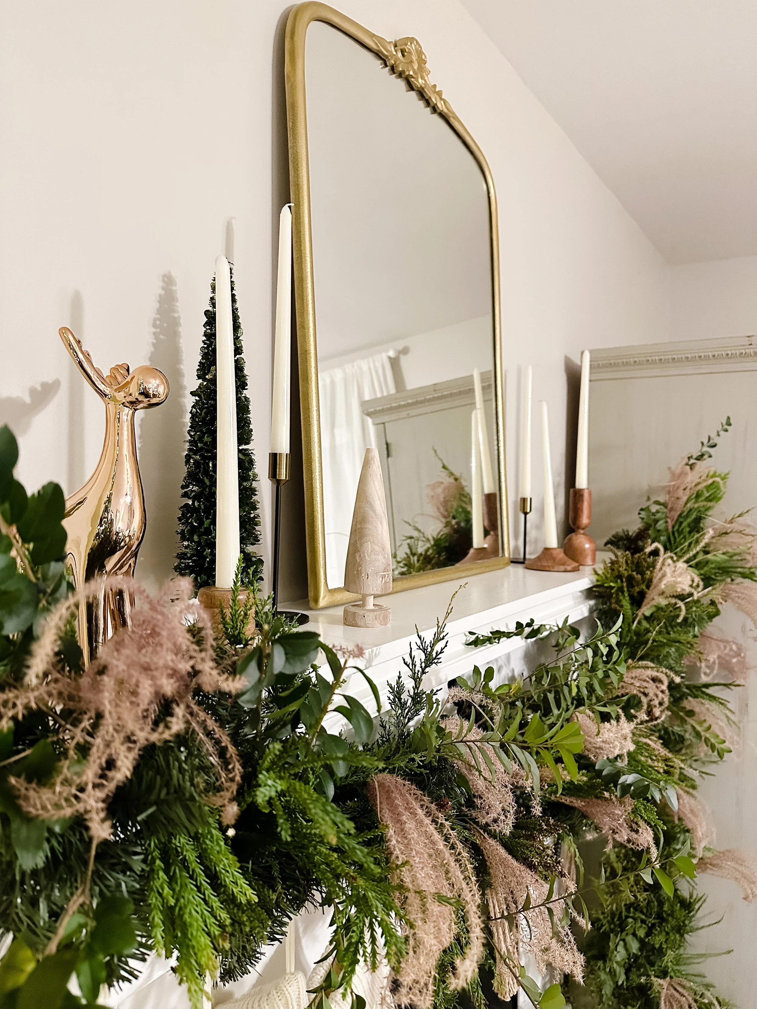 I wanted to combine a very organic feeling garland with some moody pops and some metallic decor elements surrounding it. I like the juxtaposition of those things together. With abundant texture and a feeling of warmth, I also wanted to highlight the mirror that lives permanently on the mantle. I chose to do so with an eclectic collection of taper candle holders and cream tapers. Because the candle holders were all different, I made sure to keep the tapers themselves simple and consistent. I included a couple of textural trees that brought the green and wood elements up on top of the mantle and topped it all off with my copper moose, my favorite little Christmas guy.