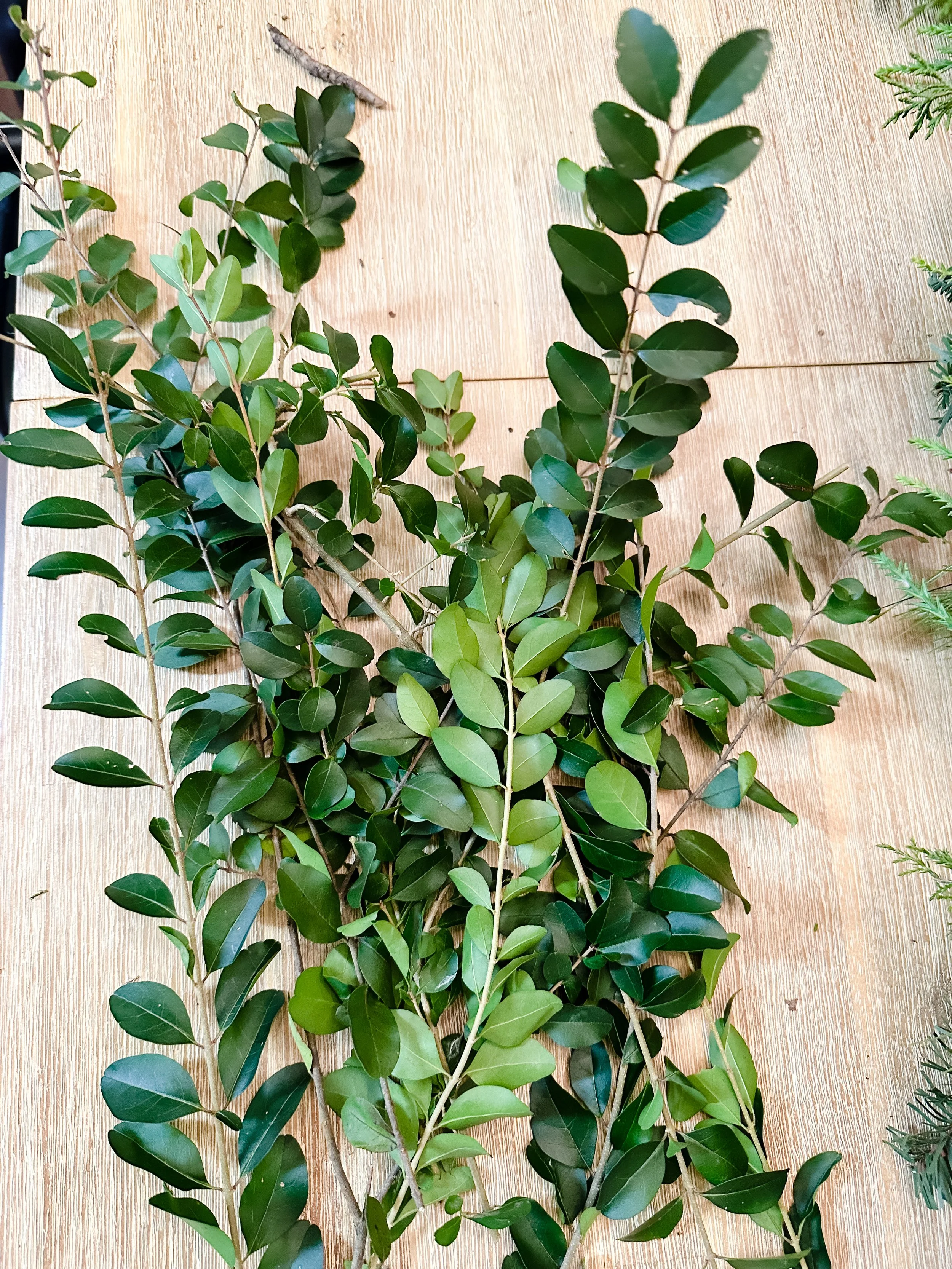 With a solid and lush base of green going, I decided that I really liked the shape of the leaves on the Chinese Privet. We had this one at home in Washington State too. I also liked how long the pieces were and so I could use it to add some “wild child” pieces to this semi tamed garland. So, I got my hands moving and added some entertainment value to this garland and really saw it begin to take shape. For any pieces that are simply too long to work with, snip them off right above a leaf so that you create two usable pieces out of the one. This way the bottom piece doesn’t have a stick at the top but rather looks like it could possibly be the end of a branch with a leaf on the tip.