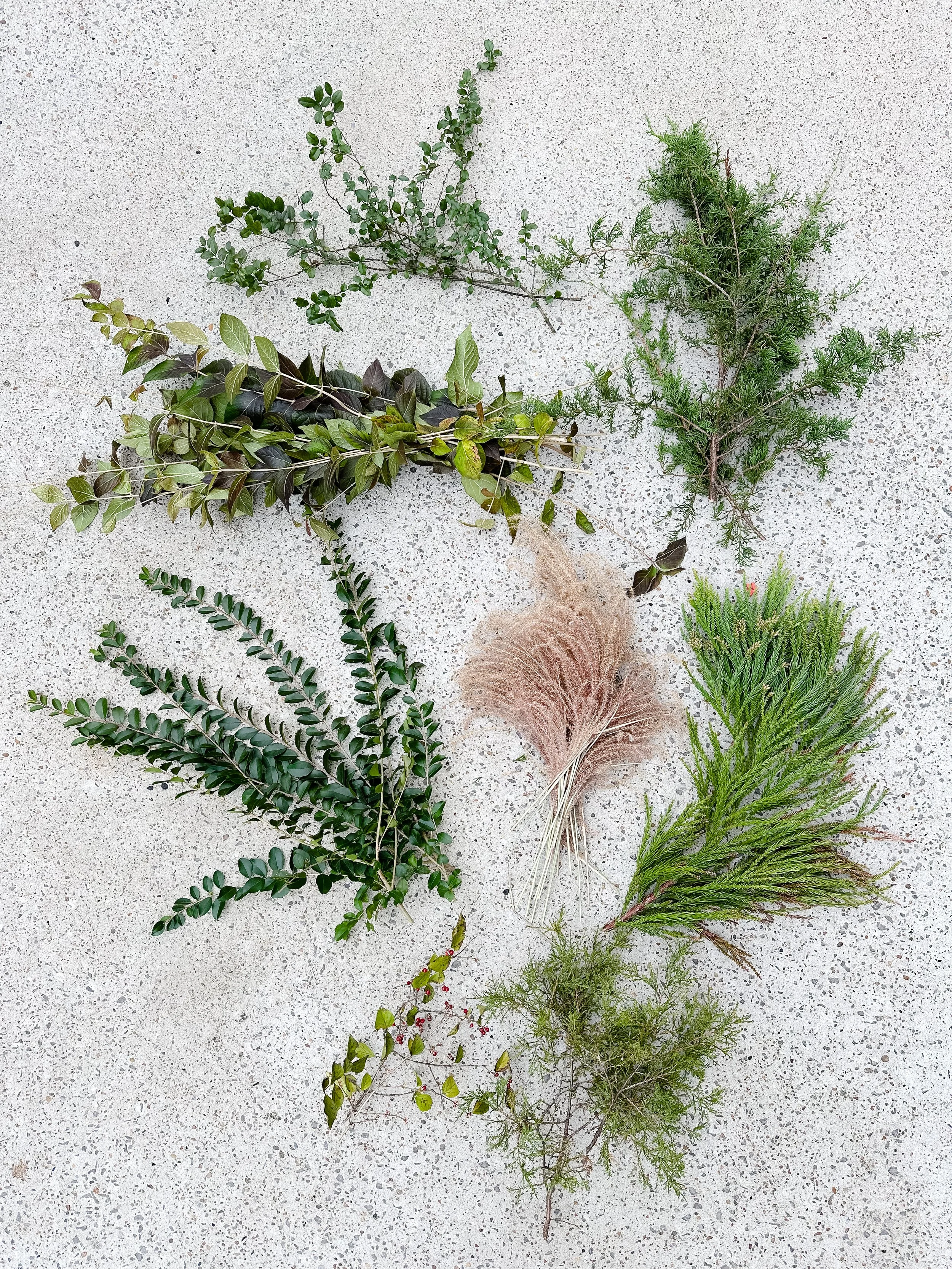 I headed to the backyard, the neighbors yard, and a back country road to find some goodies to spruce this baby up. When working with floral or foliage, I like to find pieces that vary in size, shape and texture to give good visual interest. I like to create a combination of pieces that are heavy and create a solid base, some that are airy and whimsical and then some in the middle. Here’s what I ended up with.