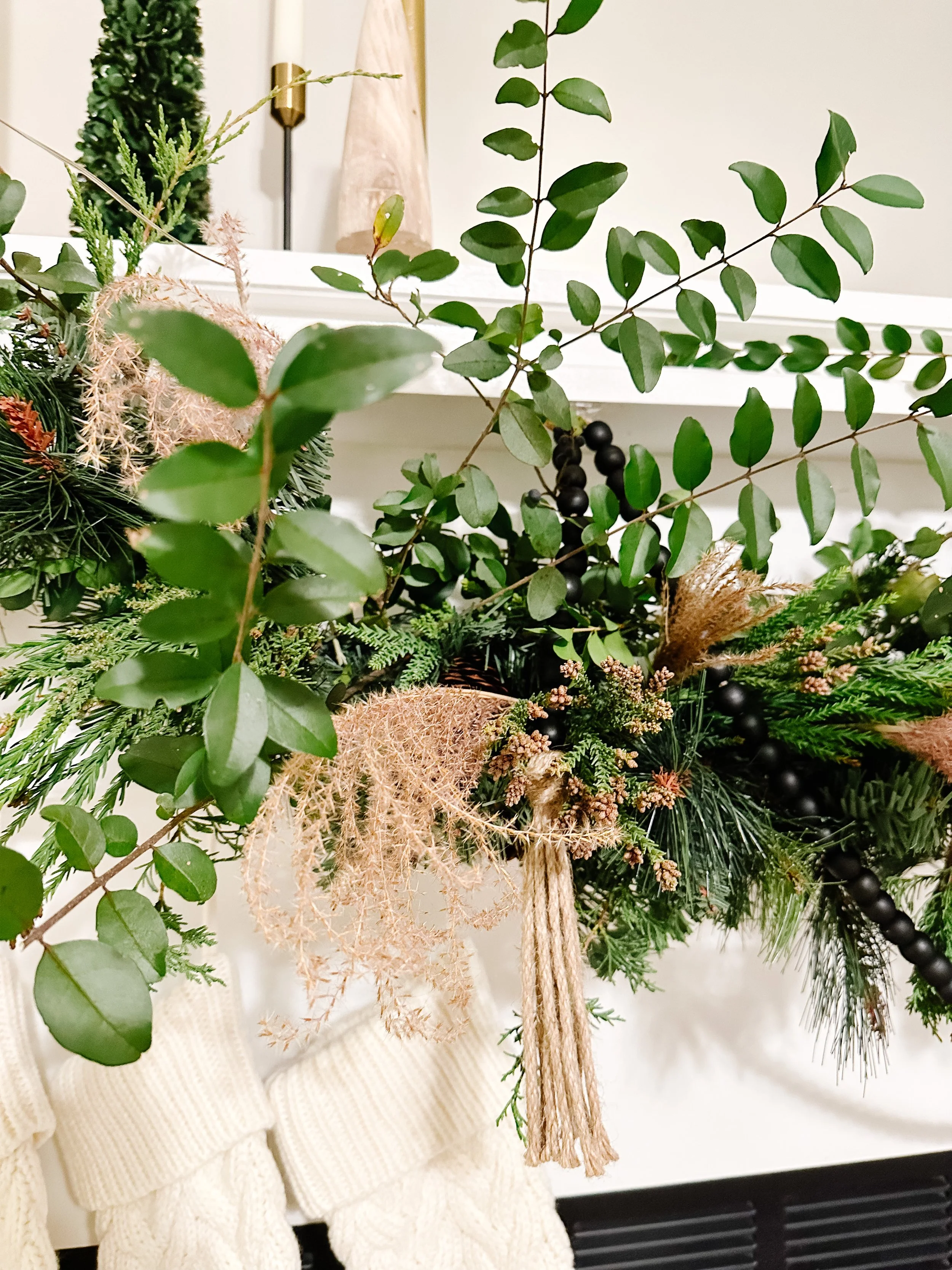 I wanted to add in some moody wooden beads for a fun and different texture to accompany the greenery. I used command hooks to simply hang the strand of beads from different anchor points from the garland so that it would add dimension.