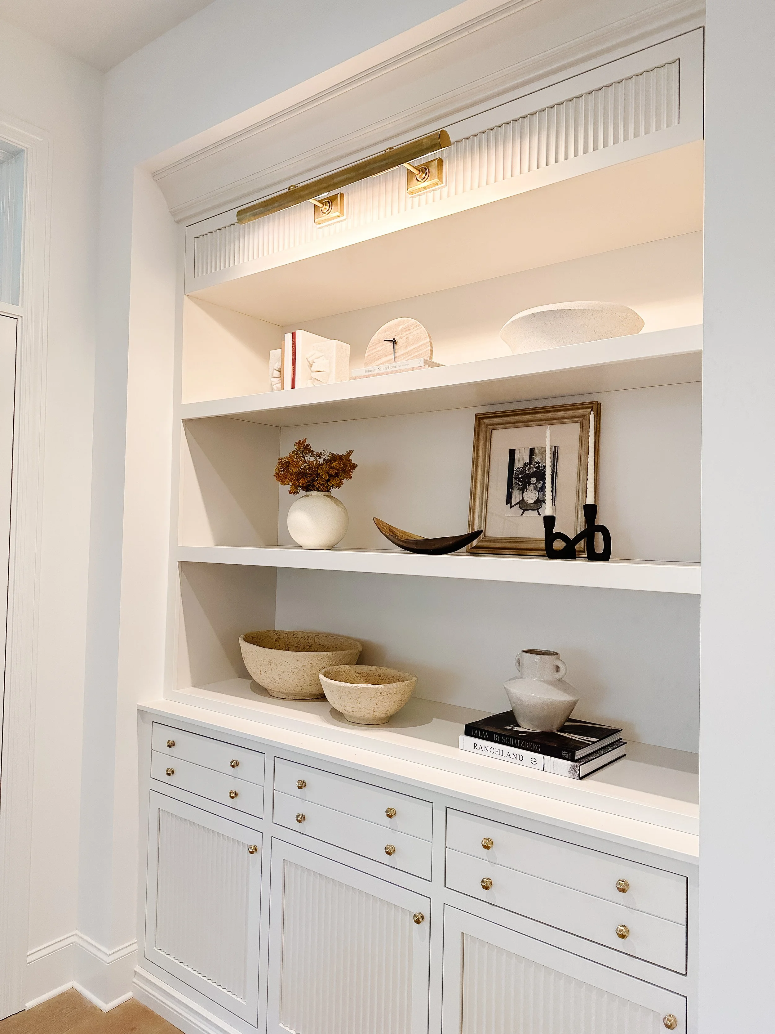 When it comes to shelf, coffee table and console styling, I love to utilize pieces with a larger scale. This creates a space that is full of visual interest, but doesn’t feel too busy, trinkety or nick-nacky. If you have pieces that are important to you but that are on the smaller side, these can be thoughtfully layered in front of specific larger pieces. If you ever have questions on this, feel free to shoot me a message!