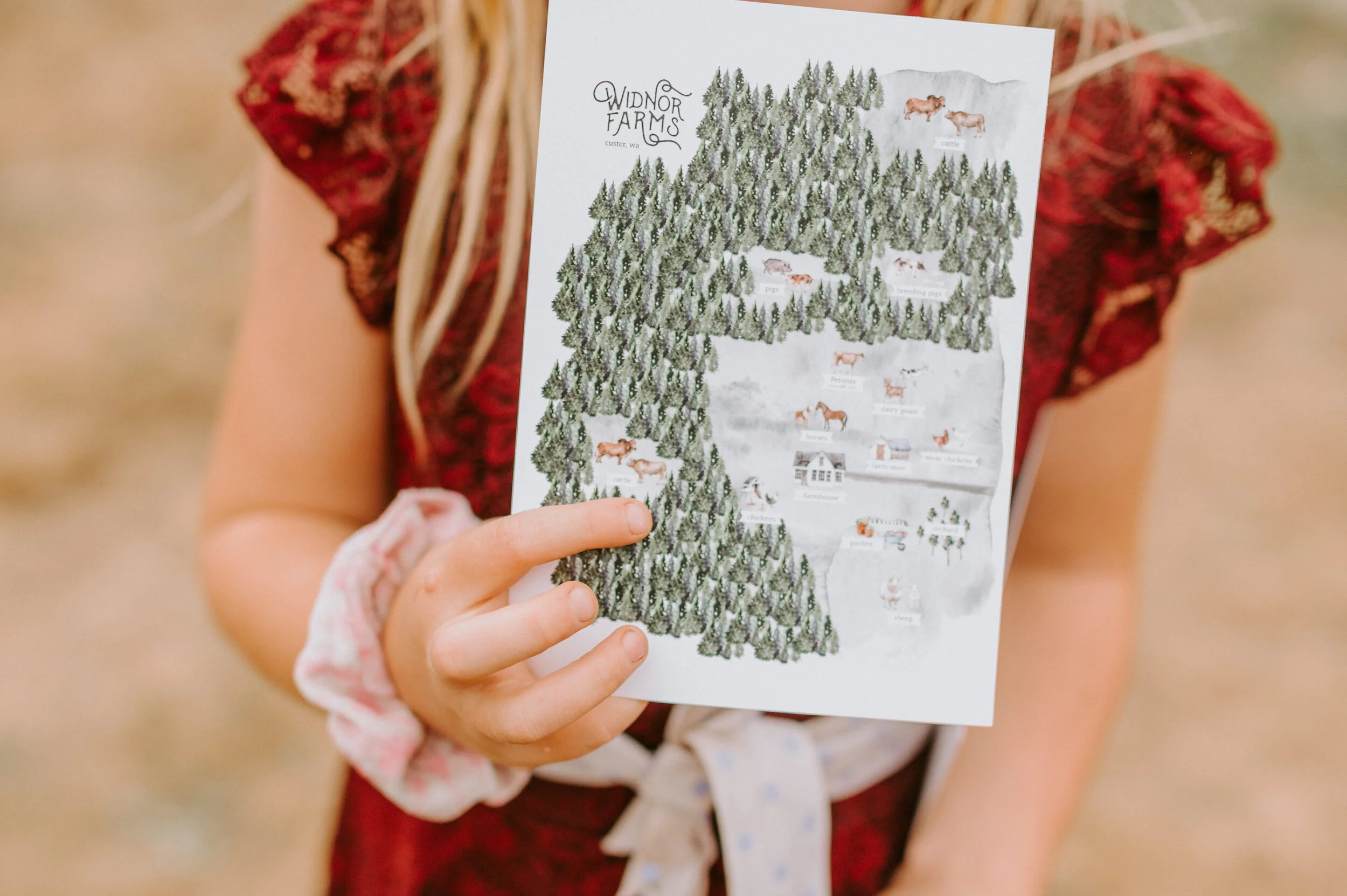 Brianna and I had talked about what the flow of the day would look like and in our conversation we discussed guests arrival and creating a way to familiarize them with the farm. A custom map of the property felt like it would be a really nice way to give a pretty illustration, while conveying any information they might be seeking. I have never designed a map before and I had so much fun doing it! As guests arrived, the Widen kiddos handed out maps to them. It ended up being a pretty sweet moment of the day.
